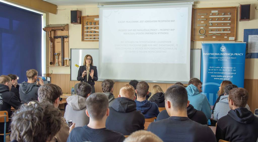 13 listopada 2025 r. w Zespole Szkół Budowlanych w Lublinie przy ul. Słowiczej 3 odbył się „Dzień z Państwową Inspekcją Pracy”. Przez kilka godzin uczniowie spotykali się z doświadczonymi inspektorami, poznawali realia rynku pracy oraz zagadnienia związane z bezpieczeństwem podczas wykonywania prac budowlanych.